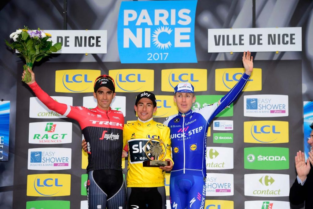 Contador hatte das Rennen erneut schwer gemacht und bereits am vorletzten Berg attackiert. Wie schon am Vortag bereitete Teamkollege Jarlinson Pantano den Angriff des Trek-Segafredo-Kapitäns vor. Als Contador etwas weniger als 50 Kilometer vor dem Ziel attackierte, konnte Sergio Henao im Gelben Trikot zunächst noch folgen. Doch dann musste auch er reißen lassen und Contador zog davon. Der Madrilene holte die Ausreißergruppe um Soler und De la Cruz ein. Contador bekam nur wenig Hilfe, genau wie Henao in der Verfolgergruppe, und so lieferten sich die beiden einen Kampf Mann gegen Mann. Am berühmten Col d’Èze, dem letzten Anstieg des Rennens, sah es so aus, als könnte Contador tatsächlich die nötigen 31 Sekunden Vorsprung auf Henao bis nach Nizza retten.