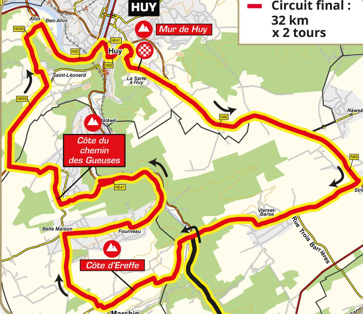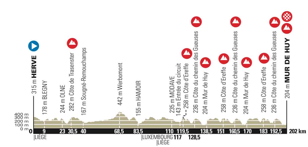Gestartet wird das Rennen in diesem Jahr in Herve. Nach einer kleinen Schleife geht es gen Süden und dann gen Westen in Richtung Huy. Nach 137 Kilometern ist die Schlusssteigung das erste Mal erreicht. Anschließend geht es auf zwei Runden, die jeweils 32 Kilometer lang sind.