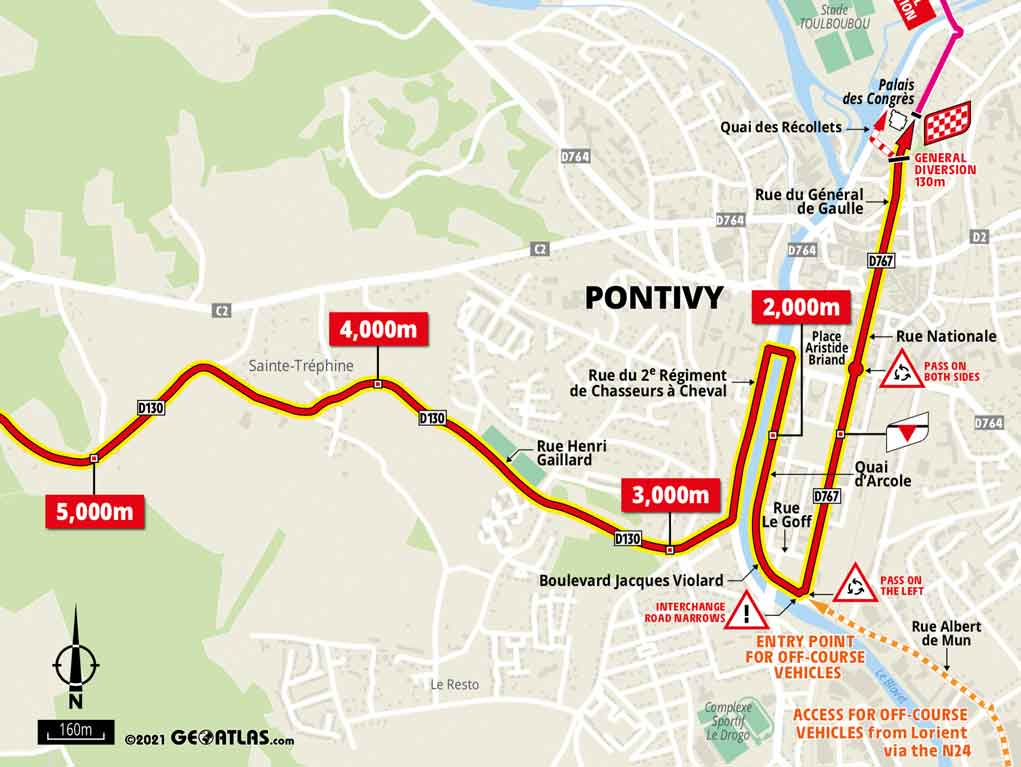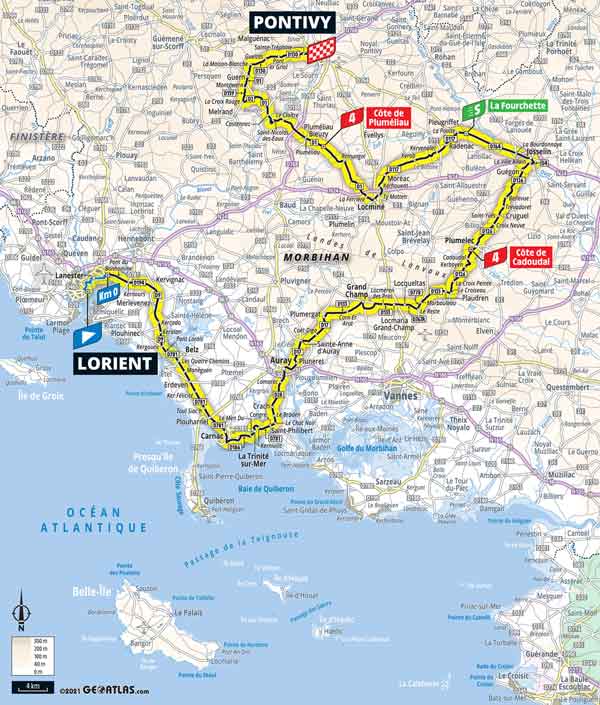 Nach dem Start in Lorient geht es gen Südosten entlang der Küste und nach einigen Kilometern dann nordöstlich. Die erste Bergwertung steht nach 91 Kilometern an. Vermutlich wird sich hier ein Ausreißer den einen Bergpunkt sichern. Die Sprintwertung des Tages wird 65 Kilometer vor dem Ziel ausgetragen. Von der letzten Bergwertung sind es dann noch 35 Kilometer bis ins Ziel.