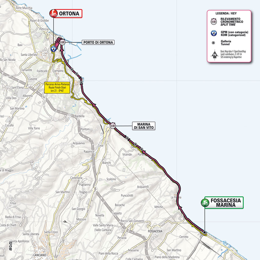 Der Parcours führt zunächst entlang der Küste auf einem schmalen Fahrradweg mit einigen Tunneln gen Norden. Es ist komplett flach und ideal für die Tempo-Maschinen. Satte 16 Kilometer geht es flach bis zum Hafen von Ortona – dann geht es hinauf zum Ziel.