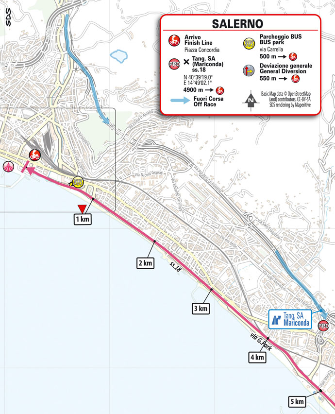 Start und Ziel liegen nicht all zu weit auseinander, die Strecke beschreibt einen Bogen und so sind es am Ende etwas mehr als 170 Kilometer, die das Peloton zurücklegen muss. Mit Salerno wird der südlichste Etappenort dieses 106. Giro erreicht, anschließend geht es langsam wieder gen Norden.