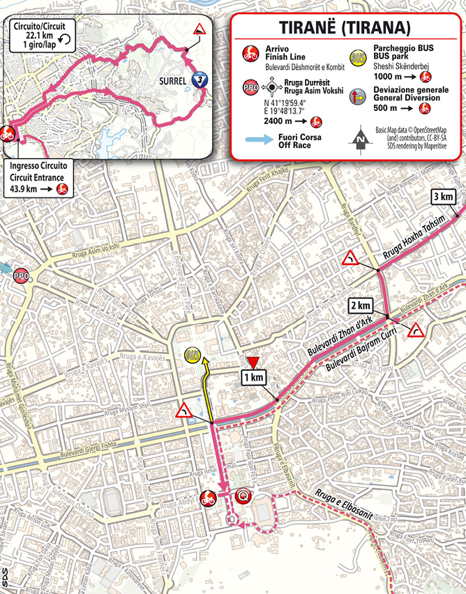Es folgen eine lange Abfahrt und ein Flachstück, dann geht es nach Tirana. Zuvor wird noch der Red Bull Sprint abgenommen, wo es 6 Bonussekunden für den Ersten gibt, im Ziel erhalten die ersten drei 10, 6 bzw. 4 Sekunden Bonifikation. 44 Kilometer vor dem Ende sehen die Fahrer das Ziel – kommen allerdings von der anderen Seite und gehen anschließend auf die zwei Schlussrunden. Die Straßen sind stellenweise schmal und das Positionieren wird sehr wichtig sein.