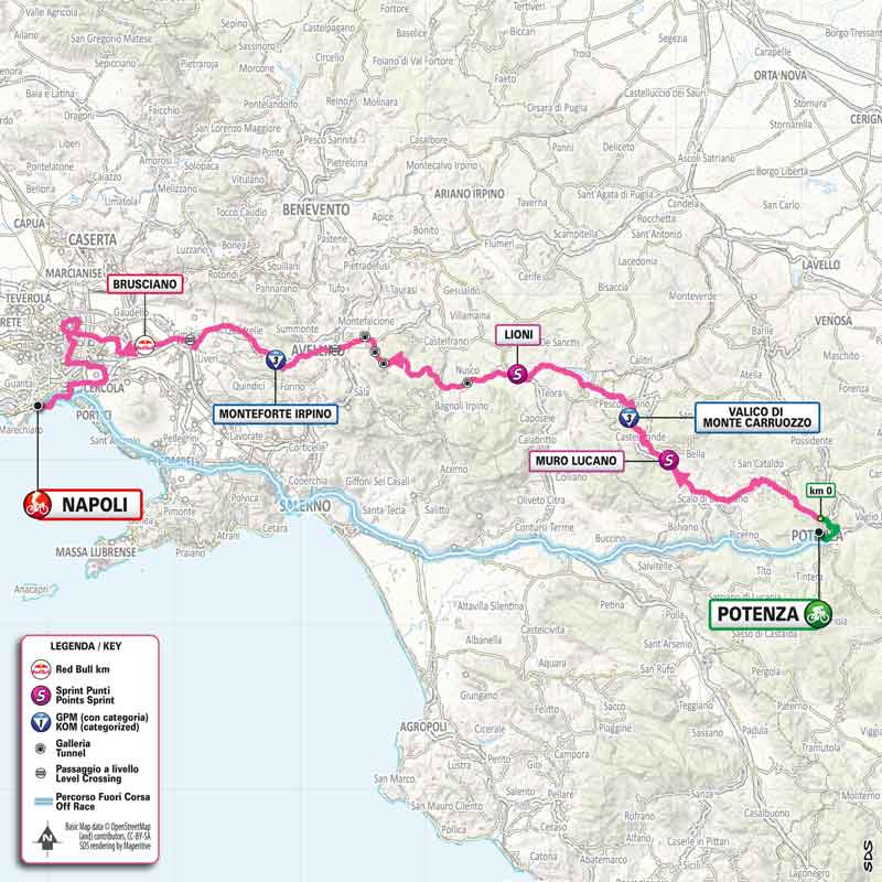 Von Potenza geht es gen Westen. Direkt nach dem Start geht es bergauf. Es folgt eine lange Abfahrt und anschließend geht es zur ersten Bergwertung. Es bleibt wellig, bis rund 80 Kilometer vor dem Ende die letzte Steigung gemeistert ist und es flach zum Ziel geht.