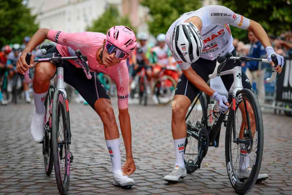 Juan Ayuso musste früh reißen lassen, kassierte am Ende mehr als 10 Minuten auf die anderen Klassementfahrer. Er hatte einen schlechten Tag, vielleicht auch durch die Stürze der vergangenen Tage beeinflußt. An nur einem Tag bei diesem Giro ist die herausragende Situation des Teams UAE in der Gesamtwertung Geschichte. Zwei Fahrer in den Top3 – Doppelspitze mit dem jungen Del Toro und dem etwas erfahreneren Ayuso – so ging man komfortabel in Woche drei. Rosa verteidigt, aber nun steht man unter Druck!