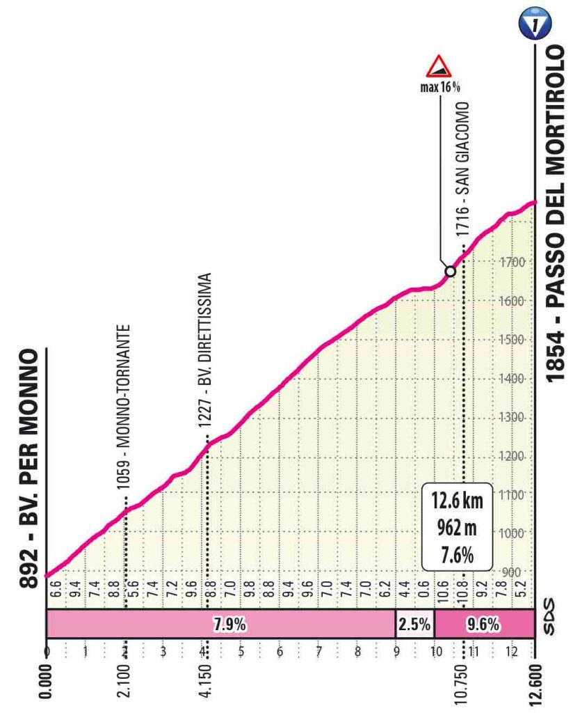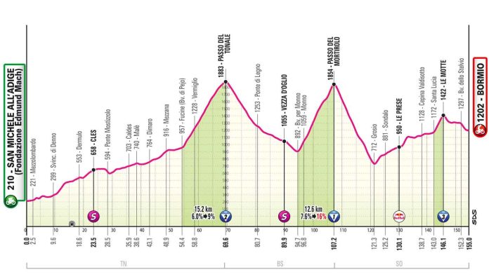 Die ersten 55 Kilometer sind flach, setzt sich schnell eine stark besetzte Gruppe ab, könnten sie mit durchaus komfortablem Vorsprung in den Tonale gehen. Dann könnte es wieder ein Tag für Ausreißer werden. Doch wird an den Anstiegen im Feld direkt richtig Tempo gemacht, wird es schwer, sich vor den Klassementfahrern zu halten. Ist die Abfahrt vom Mortirolo geschafft, sind es noch mehr als 30 Kilometer bis ins Ziel, mit einem kurzen Anstieg rund 13 Kilometer vor dem Ende. Es könnte erneut eine interessante Etappe werden.