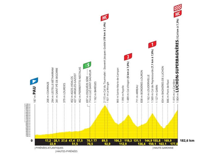 Die Etappe startet in Pau, eine der meistbesuchten Städte der Tour. Die ersten 70 Kilometer sind flach, dann beginnt nach dem Zwischensprint die Kletterei.