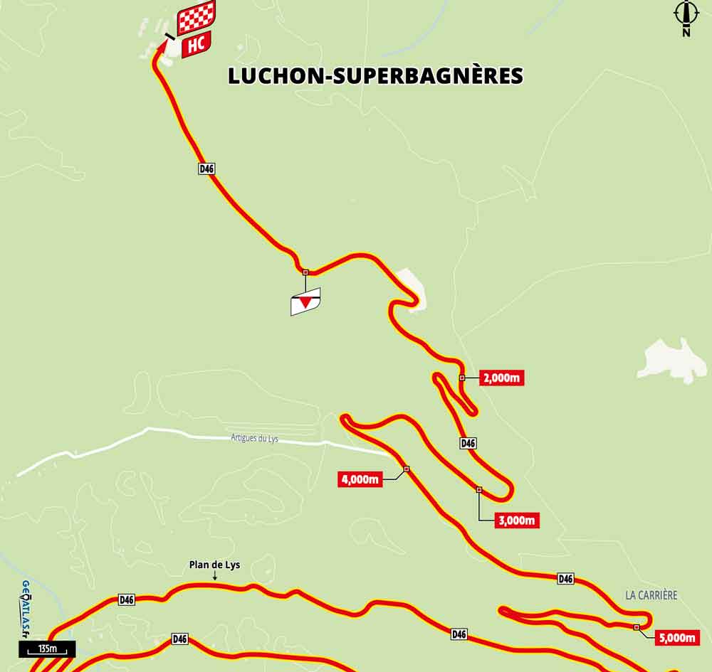 Nach der schnellen Abfahrt vom Peyresourde geht es dann zur Schlusssteigung nach Luchon-Superbagnères. Ein langer Anstieg der höchsten Kategorie. 12,4 Kilometer mit durchschnittlich 7,3% Steigung. Ein happiger Anstieg, der im unteren Teil noch moderat steil ist, in der zweiten Hälfte aber auch steile Passagen hat.