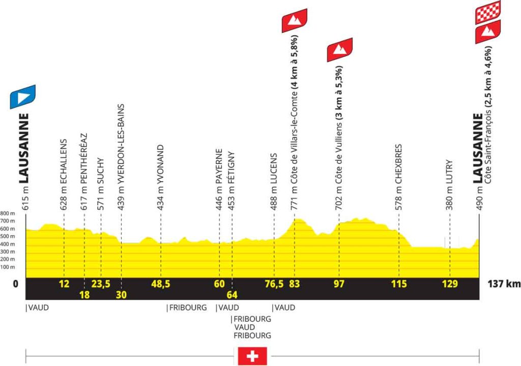 Puncheur oder Sprinterin? Auf der 1. Etappe am 1. August mit Start und Ziel in Lausanne dürfen sich einige Fahrerinnen Chancen auf das erste Gelbe Trikot der Rundfahrt machen. Mit 1.700 Höhenmetern zählt das 137 Kilometer lange Teilstück zu den Flachetappen – allerdings wartet im Finale mit der Côte Saint-François (2,5 km à 4,6 %) eine Hürde, die einigen Sprinterinnen den Zahn ziehen könnte.
