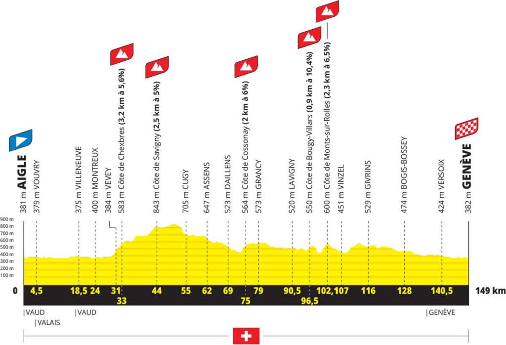 Der dritte Tag der Rundfahrt führt das Feld nach Frankreich. Vom Start in Genf bis zum Zielort Poligny sind auf dem hügeligen Teilstück 157 Kilometer mit 2.430 Höhenmetern zurückzulegen. Gleich nach dem Beginn geht es zum Col de la Faucille (11,4 km mit 6,3 %) hinauf – wie gemalt für eine gut besetzte Fluchtgruppe.