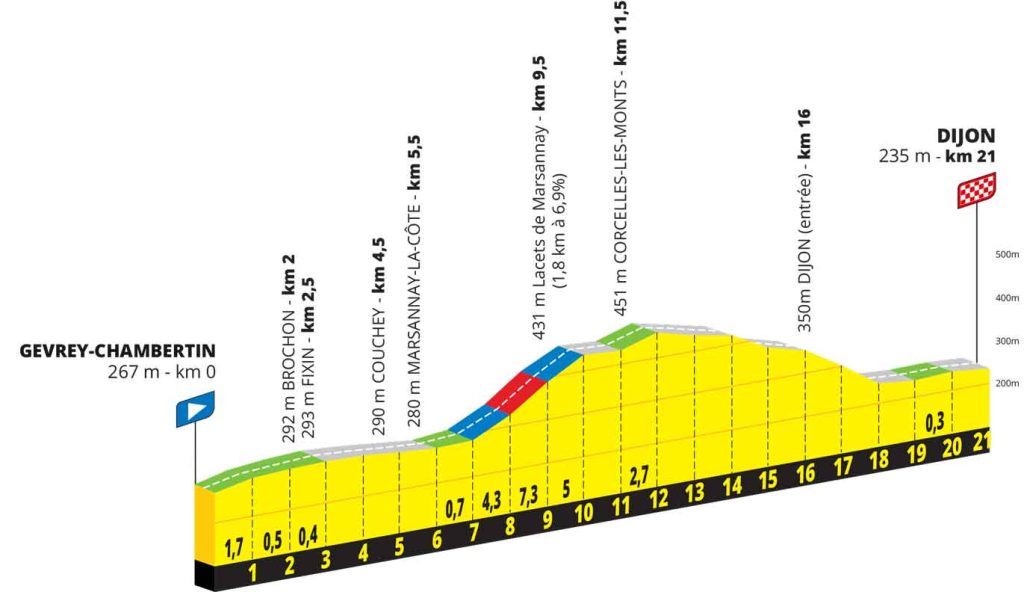 Für die GC-Kandidatinnen wird es am 4. August ernst: Beim 21 Kilometer langen Einzelzeitfahren von Gevrey-Chambertin nach Dijon geht es um wichtige Sekunden beim Kampf um das Gelbe Trikot. Nach flachem Beginn gilt es zur Hälfte des Kurses eine kurze Rampe (1,8 km mit 6,9 %) hochzufahren, bevor es hinunter zum Ziel geht.