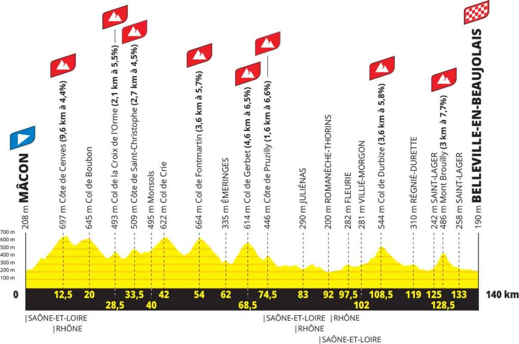 Rauf und runter geht es am 5. August für das Feld, wenn es sich auf den 140 Kilometer langen Weg (inklusive 2.850 Höhenmetern) von Macon nach Belleville-en-Beaujolais macht. Insgesamt acht Anstiege stehen auf dem Programm dieses hügeligen Teilstücks – die Vorentscheidung über den Tageserfolg dürfte am Mont Brouilly (3 km mit 7,7 %) fallen, der rund 10 km vor der Ziellinie zu Attacken einlädt.
