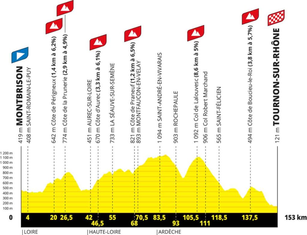 Hügelig geht es auf der 6. Etappe am 6. August weiter: 153 Kilometer mit sechs Anstiegen (2.650 Höhenmeter) liegen zwischen dem Startort Montbrison und dem Zielort Tournon-sur-Rhone – das Mittelgebirge bietet reichlich Optionen für Ausreißversuche, beispielsweise am Col de Lalouvesc (8,6 km mit 5 %). Der finale Anstieg (3,8 km, 5,7 %) liegt knapp 15 km vor dem Ziel, bevor die Abfahrt zum Finale auf der Quai Farconnet in Tournon-sur-Rhone führt.
