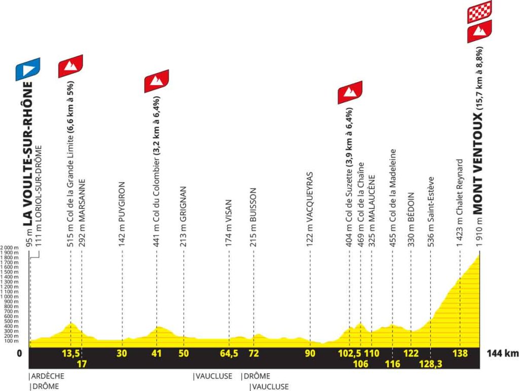 Die 7. Etappe mit der Bergankunft am legendären Mont Ventoux ist zweifellos die Königinnenetappe der Frankreich-Rundfahrt 2026. Die Etappe startet in La Voulte-sur-Rhone und führt das Peloton am 7. August über 144 Kilometer hoch zum kahlen Riesen der Provence. Mit dem Col de la Grande Limite (6,6 km, 5 %), dem Col du Colombier (3,2 km, 6,4 %) und dem Col de Suzette (3,9 km à 6,4 %) sind drei kürzere Anstiege zu befahren, bis es über Bédoin hinauf zum Gipfel des Mont Ventoux geht (15,7 km mit 8,8 %).