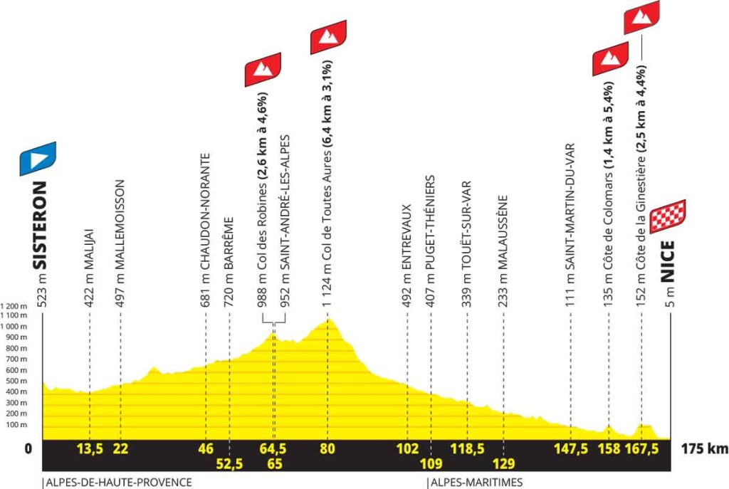 Das Schlusswochenende der Tour de France avec Zwift wird am 8. August mit einer flacheren Etappe von Sisteron nach Nizza eingeläutet (175 km, 1.420 Höhenmeter). Auf dem längsten Teilstück dieser Rundfahrt steht 6 km vor dem Ziel eine steile Rampe (bis zu 13,6 %) im Weg, die einen Massensprint verhindern könnte.