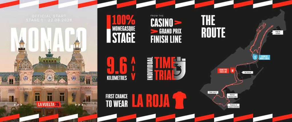 Die 81. Ausgabe der La Vuelta startet in Monaco. Los gehts am 22. August 2026 mit einem 9,6 Kilometer langen Einzelzeitfahren. Das teilte die Organisation am Samstag mit. Die Strecke soll vollständig durch die Straßen des Fürstentums führen, an einigen der berühmtesten Orte Monacos vorbei. Darunter dem Place du Casino mit seinem Hôtel de Paris und dem Café de Paris, dem Viertel Moulins, der Fairmont-Kurve, dem Viertel Larvotto, dem Port Hercule, dem Port de Fontvieille. Zudem soll die Ziellinie an der Start-/Ziellinie des berühmten Formel-1-Grand-Prix liegen.