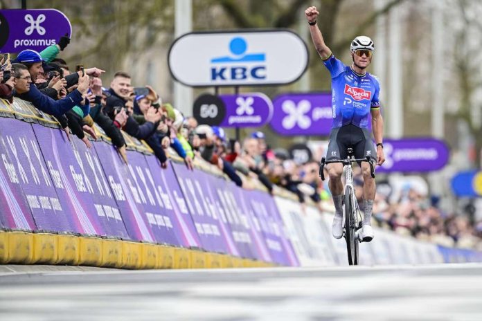 Mathieu van der Poel (Alpecin-Premier Tech) hat den 81. Omloop Nieuwsblad gewonnen. Der Niederländer löste sich an der Mauer von Geraardsbergen aus der kleinen Spitzengruppe und siegte als Solist. Rang zwei ging an Tim van Dijke (Red Bull-Bora-hansgrohe), Florian Vermeersch (UAE Team Emirates – XRG) wurde Dritter. Beide hatten sich gemeinsam mit Van der Poel am Molenberg aus dem Feld abgesetzt, mussten den Niederländer dann aber an der Muur ziehen lassen.