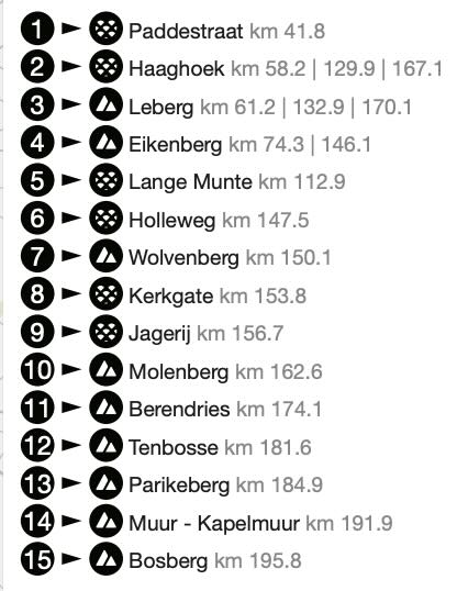 Über die Lange Munte kommt man von Norden wieder zurück zu Haaghoek und Leberg. Wieder geht es zum Eikenberg. Danach allerdings nicht nach Oudenaarde, sondern über den Holleweg zum Wolvenberg. Danach dann in der Anfahrt zur Schlüsselstelle Molenberg über die Pflasterstücke Kerkgate und Jagerij.