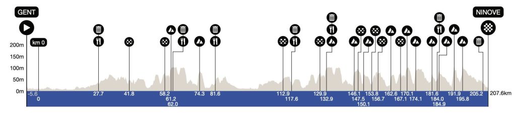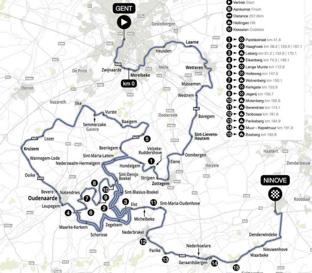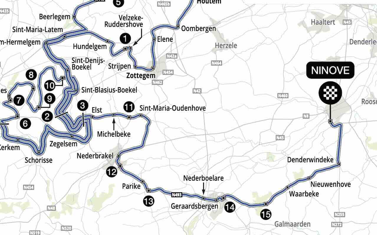 Kapelmuur und Bosberg sind die letzten beiden Hellinge – dann geht es flach zum Zielort nach Ninove. Noch vor wenigen Jahren endete das Rennen im Stadtteil Meerbeke – wo früher auch der Zielstrich der Flandern-Rundfahrt war. Doch dann zog man mit dem Ziel ins Zentrum von Ninove. Vor drei Jahren wurde das Finale noch einmal verändert und man erreicht nun den Zielstrich weniger kurvenreich auf einer breiten Straße, wo es die letzten Meter leicht ansteigend zur Linie geht.